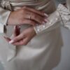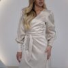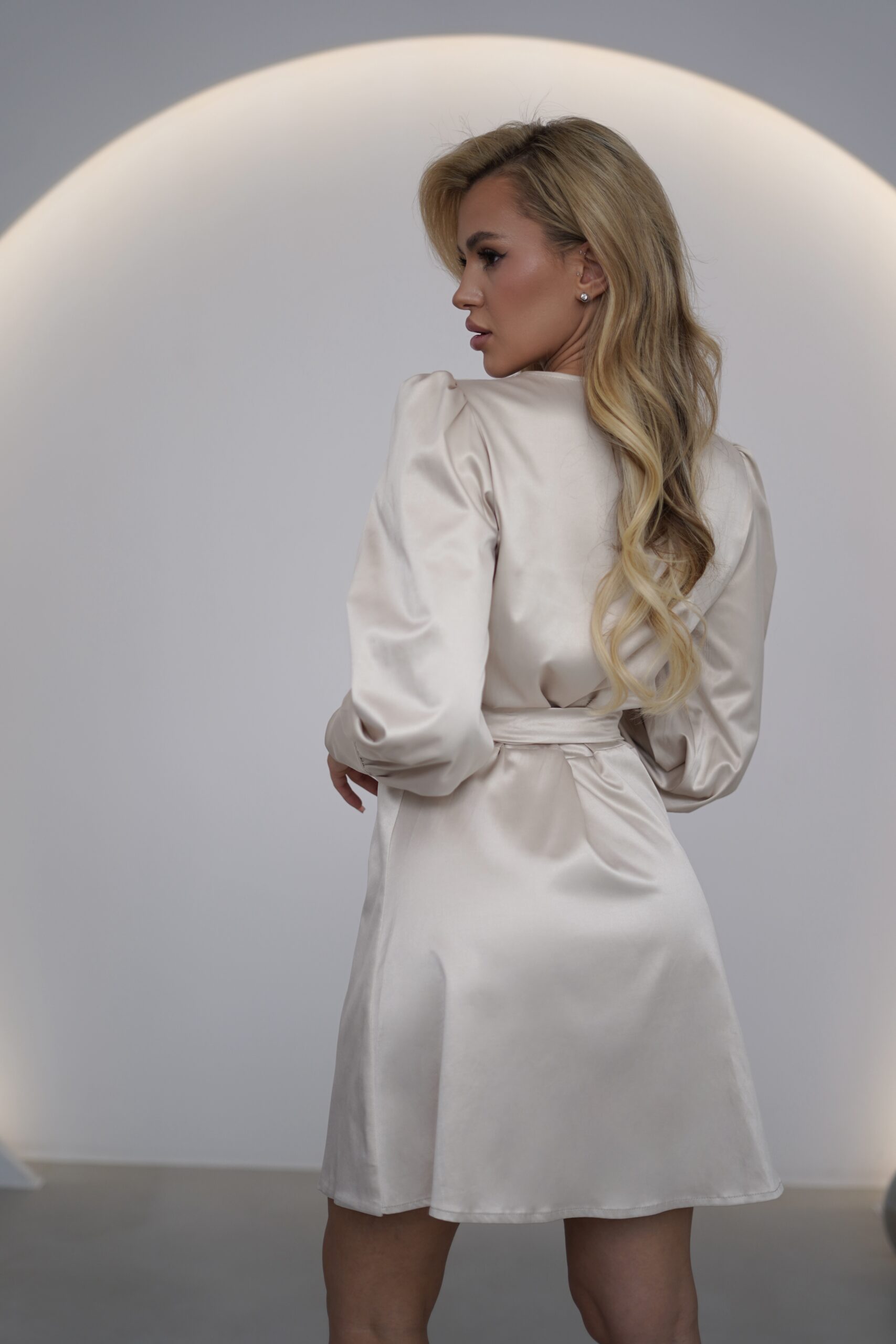 Madaleine to esencja elegancji, której nie trzeba przedstawiać. Satynowy materiał subtelnie odbija światło, tworząc miękką poświatę luksusu. Bufiaste rękawy z perłowymi guzikami i klasyczny kopertowy krój podkreślają kobiecość w najbardziej wyrafinowany sposób. Zawiązywana w talii, delikatnie otula sylwetkę – jakby szyta na miarę każdej chwili, w której chcesz poczuć się wyjątkowo.