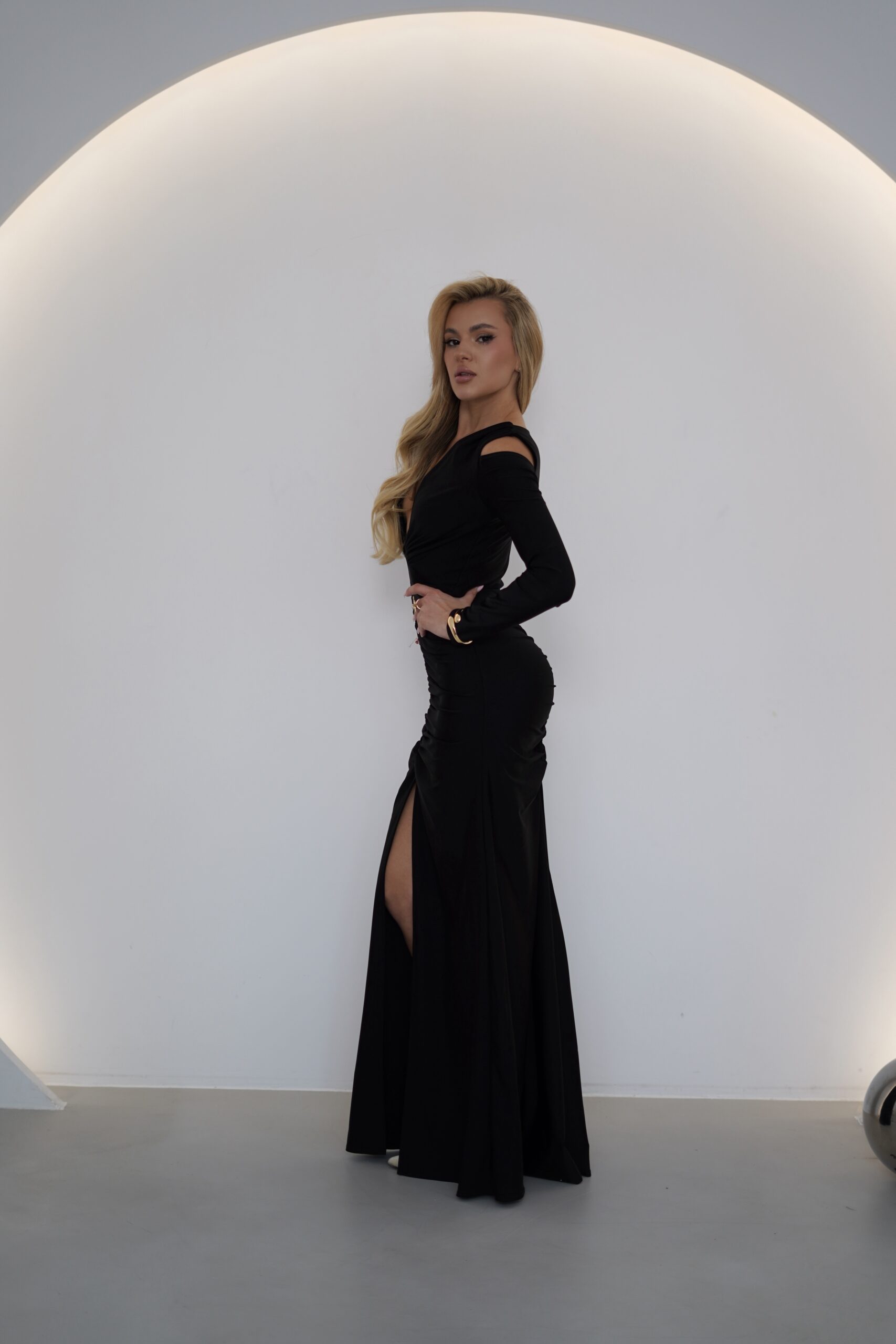 Sukienka „Viena” przedstawiona na zdjęciach to elegancka, długa suknia wieczorowa o nowoczesnym i kobiecym kroju. Oto jej główne cechy: